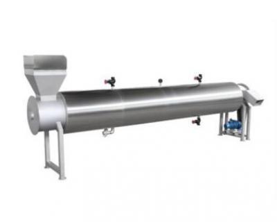 該機由機架、傳動電機、傳動罩殼、螺旋軸、進料斗、蒸汽加熱室、出料口等部件組成。工作時:無級調速電機經過鏈條驅動螺旋軸旋轉,蒸汽進入蒸汽加熱室后通過殼體表面傳熱,加熱殼體內物料。物料從進料斗進入殼體后,轉動的輸送螺旋邊推進邊預煮, 后由料翻板將物料從出料口送出。該機無級調速,可連續作業,適用多種果蔬及肉類加工。